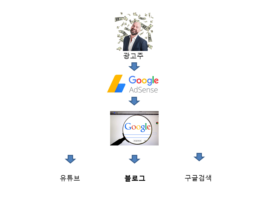 구조는 이렇다. 광고주는 에드센스에 광고를 의뢰한다. 애드센스는 구글에 광고를 의뢰합니다. 구글은 유튜브, 블로그, 구글검색 등에 광고를 송출한다. 특히 블로그의 광고 게시 영역에 광고를 송출한다.